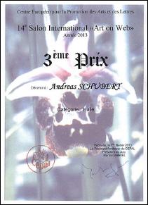 2012 / 2013 - 3. Preis in der Kategorie Öl bei Centre Européen pour la Promotion des Arts et des Lettres (Europäisches Zentrum für die Förderung von Kunst und Literatur) http://www.le-cepal.com/structurviotot.htm